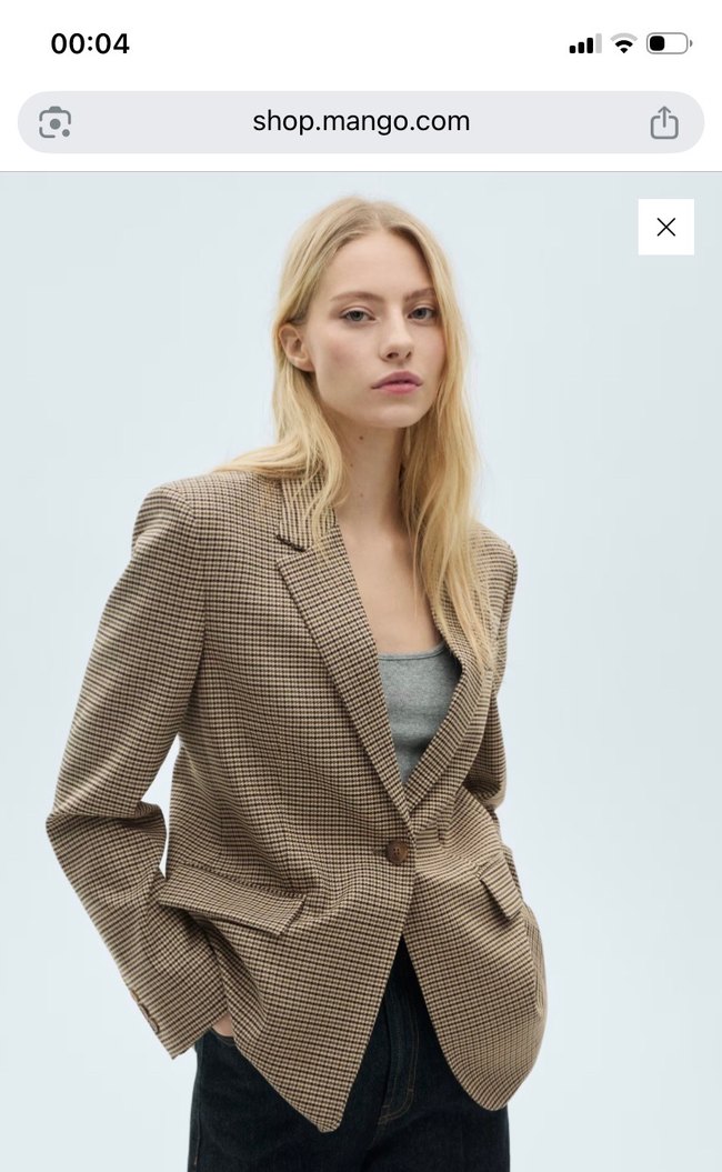 Mango etıketlı Bej ekoseli, düğmeli ve uzun kollu kadın blazer ceket. Normal kesim ve midi boyda, ofis için uygun, .