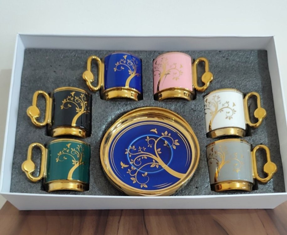 Altın saplı ve desenli, koyu mavi, pembe, siyah, beyaz, yeşil ve kahverengi renklerde altı adet kahve fincanı ve uyumlu tabaklardan oluşan set. ☕