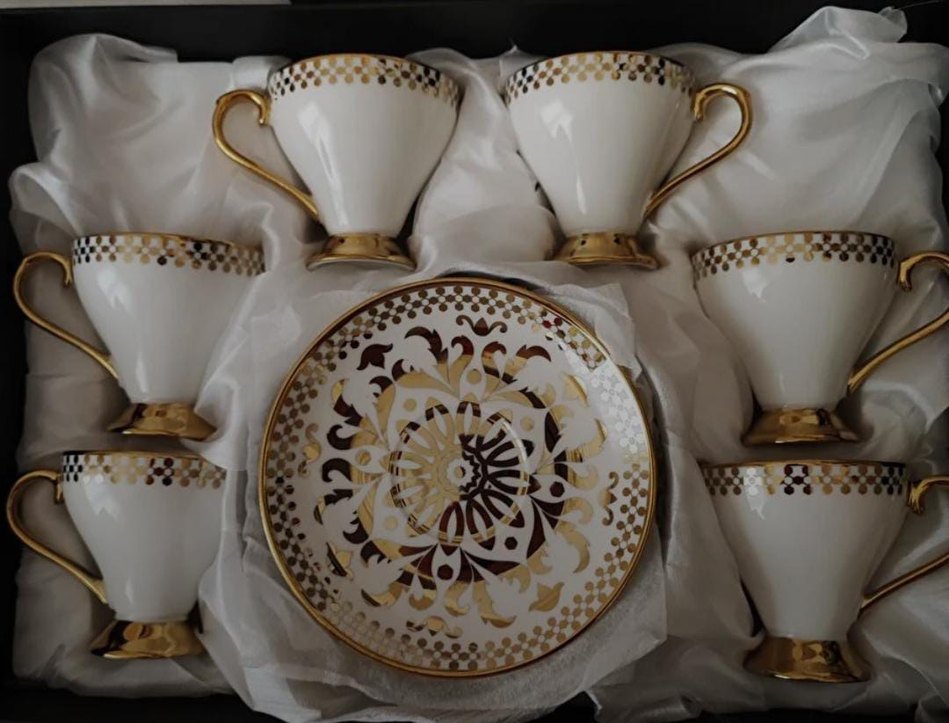 Altın saplı beyaz fincanlar ve üzerinde karmaşık altın ve koyu desenler bulunan tabaklar. Zarif tasarım, içecek servisi için uygundur. ☕