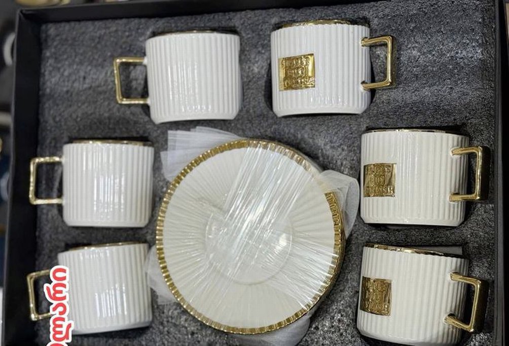 Beyaz renkte, altın detaylı ve kabartmalı dokulu fincan ve tabak seti. Tabaklar koruyucu plastikle kaplanmıştır. ☕