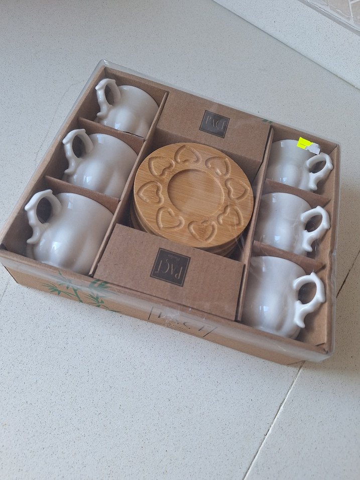 Kulplu beyaz kahve fincanları ve kalp desenli ahşap tabaktan oluşan kahve seti sıfır üründür hiç kullanılmadı