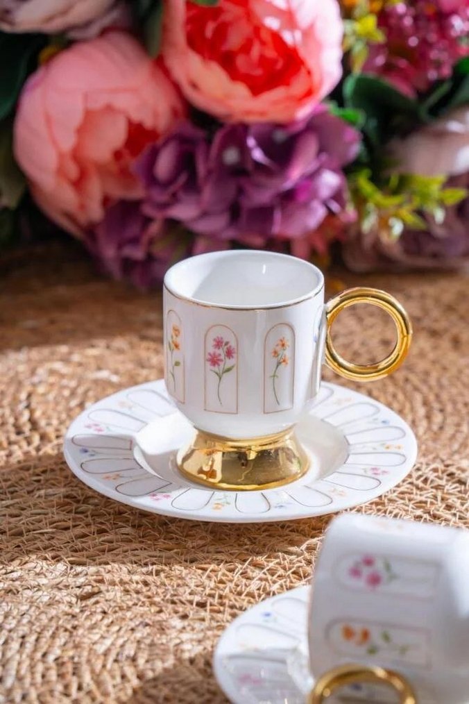 Ürün Açıklaması Aren 6 Kişilik Kahve Fincanı Takımı - 90 ml Ürün içeriği; * 6 adet kahve fincanı - 90 ml * 6 adet kahve fincanı tabağı Malzeme: Porselen Fiyat 2200 TL+ kargo 200 EVŞ Pastel çiçek desenleri ve altın saplı beyaz kahve fincanı, uyumlu tabağıyla zarif bir tasarım sunar.