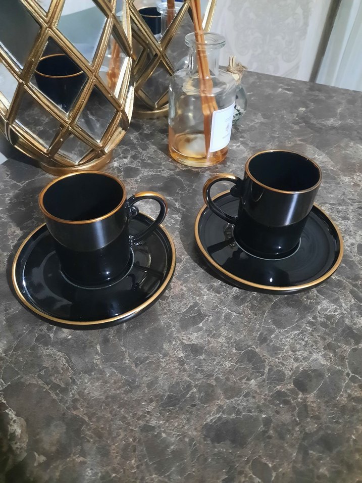 İki siyah kahve fincanı ve tabaklarından oluşan set. İkili fiyattır ayrıca ek olarak 2tane daha tabak yanında hediye edeceğim