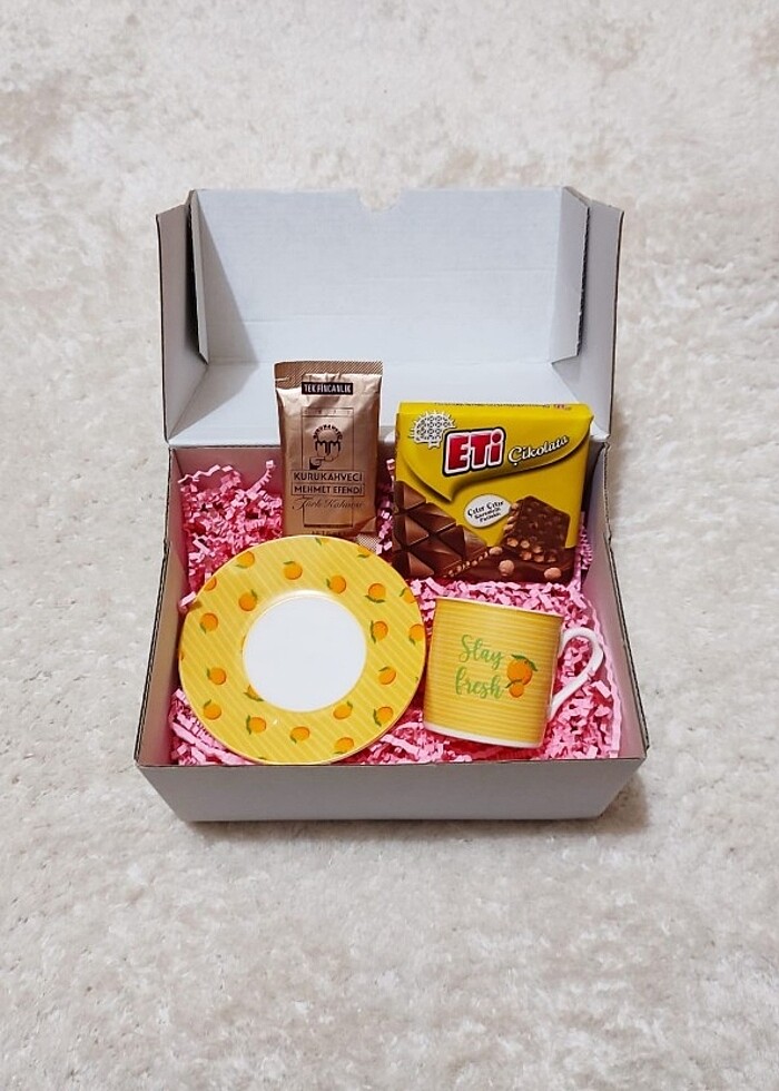 Kahve fincanı pembe kırpıklar ve hediye kutusundan oluşur.İstediginiz not içine eklenir.Baloncuklu naylona sarılı gönderim yapilir.CİKOLATA ve kahve MEVCUT DEĞİLDİR.
