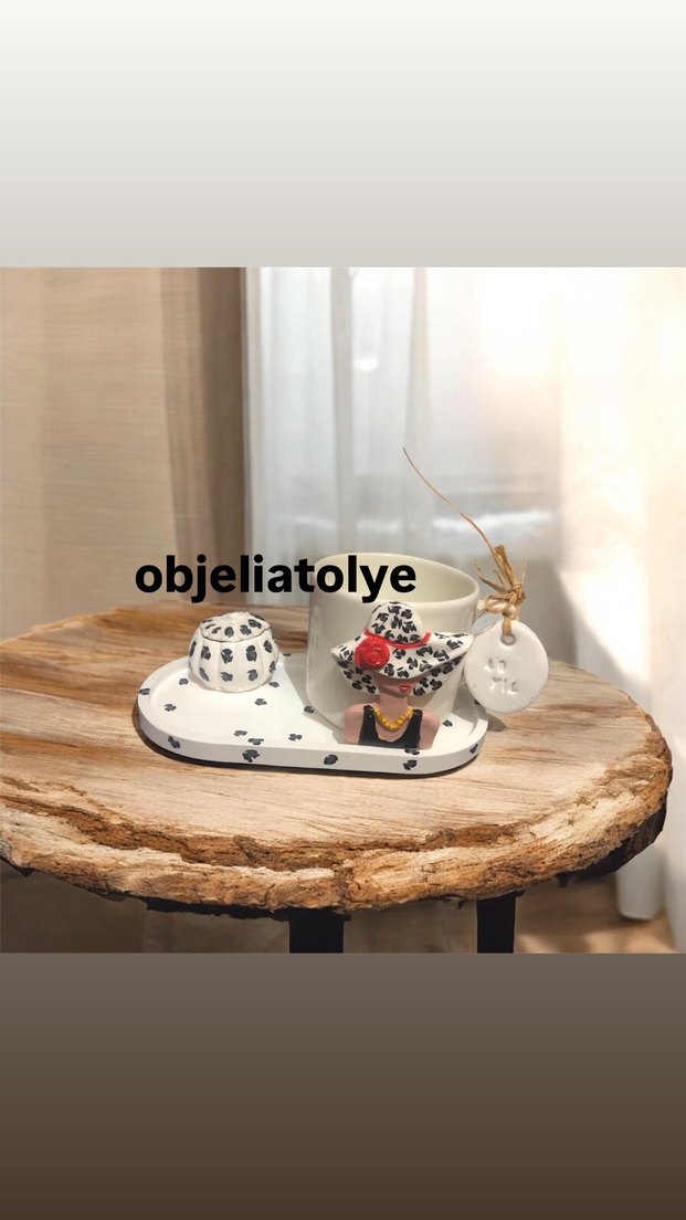 Taş tozu ile üretilmiştir settir kupa Mug porselendir istenilen renk yapılır su bazlı verniklidir Beyaz seramik bardak seti, koyu desenlerle süslenmiş küçük tabak ve özel tasarım figür içerir. Üzerinde 'objeliatolye' yazısı bulunur. ☕