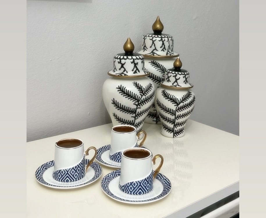 Altın saplı, koyu mavi geometrik desenli beyaz kahve fincanları az kullanıldı defosuz 6 kişilik olarak da isterseniz verebilirim
