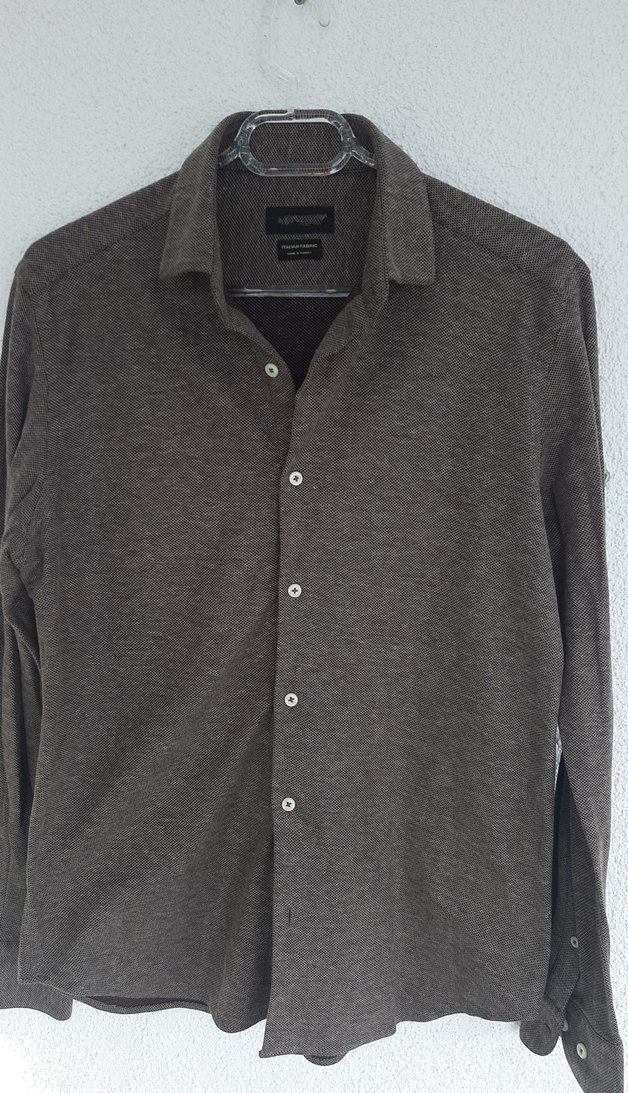 Kahve Gri renkli, keten kumaştan yapılmış uzun kollu ve düğmeli erkek gömlek. Normal kesim, yakalı ve ofis kullanımı için uygundur. Normcore tarzında sade tasarım.