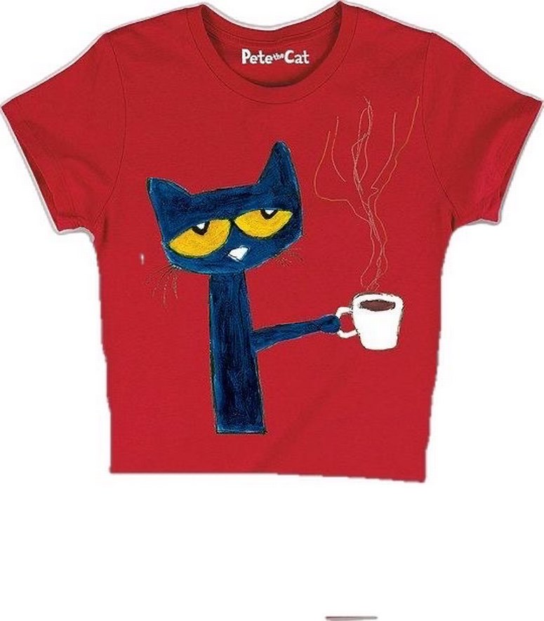 Kırmızı renkte, kahve içen kedi baskılı koyu renkli pop kültür tarzında tişört. Marka: PetewCat. ☕