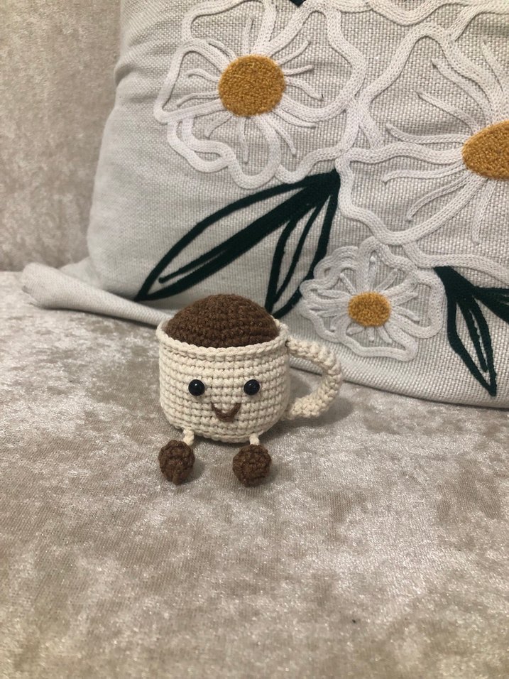 Kahverengi ve gri renklerde, yumuşak dokulu, gülümseyen fincan şeklinde küçük el yapımı peluş oyuncak. ☕