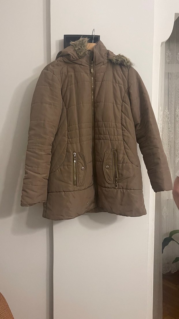 Kahve renkli, kürk detaylı kapüşonlu, uzun kollu, midi boy, dar kesim kadın mont. Sentetik kumaştan üretilmiş, günlük kullanıma uygundur.