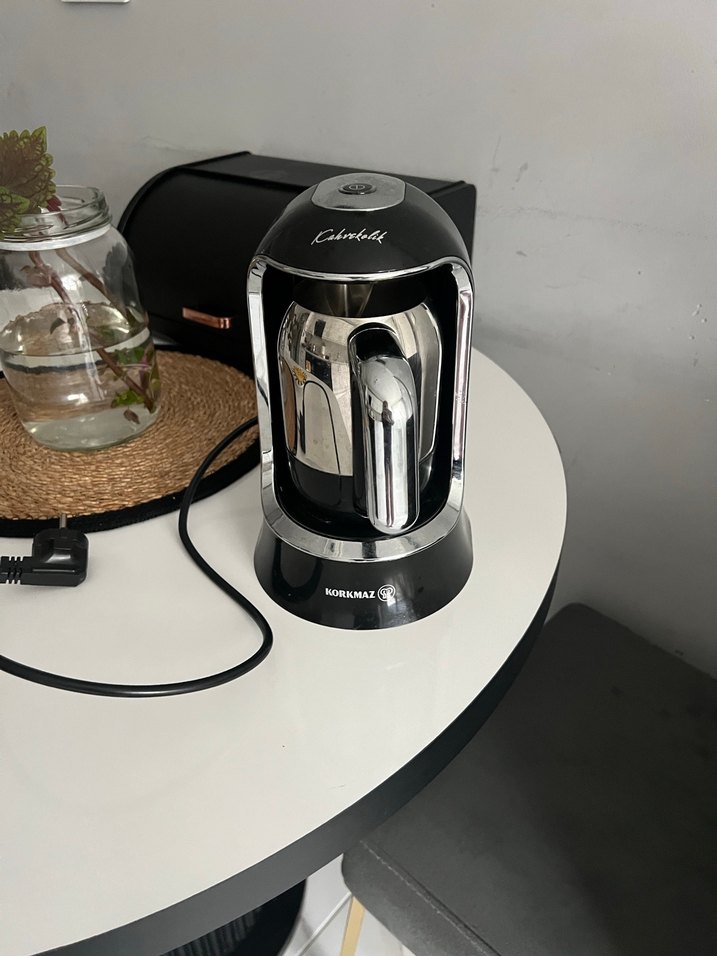 Siyah renkte, parlak yüzeye sahip modern ve kompakt kahve makinesi. ☕