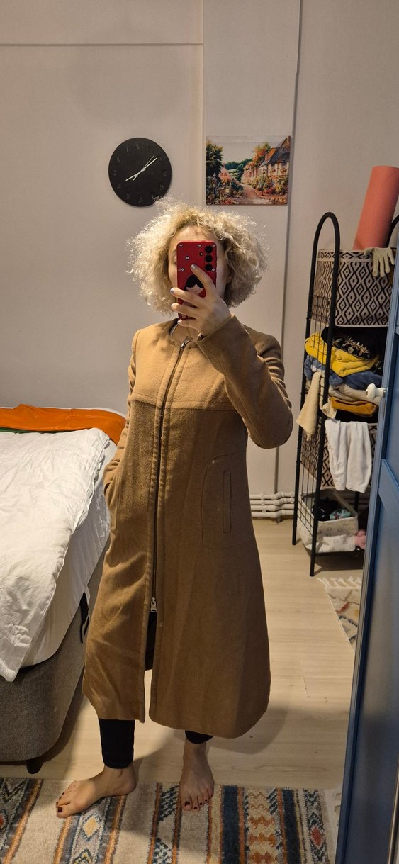 Kahverengi, midi boy, yün kumaştan kadın kaban. Uzun kollu, keskin yakalı ve sade desensiz tasarımıyla günlük kullanıma uygun.