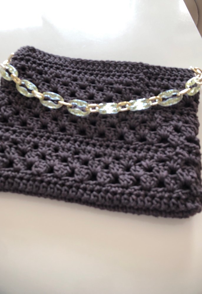 Kahve örgü kadın çanta, zincir detaylıdır ve rahat, bohem tarzıyla günlük kullanıma uygundur. Desensiz tasarımı retro ve hippie havası verir.