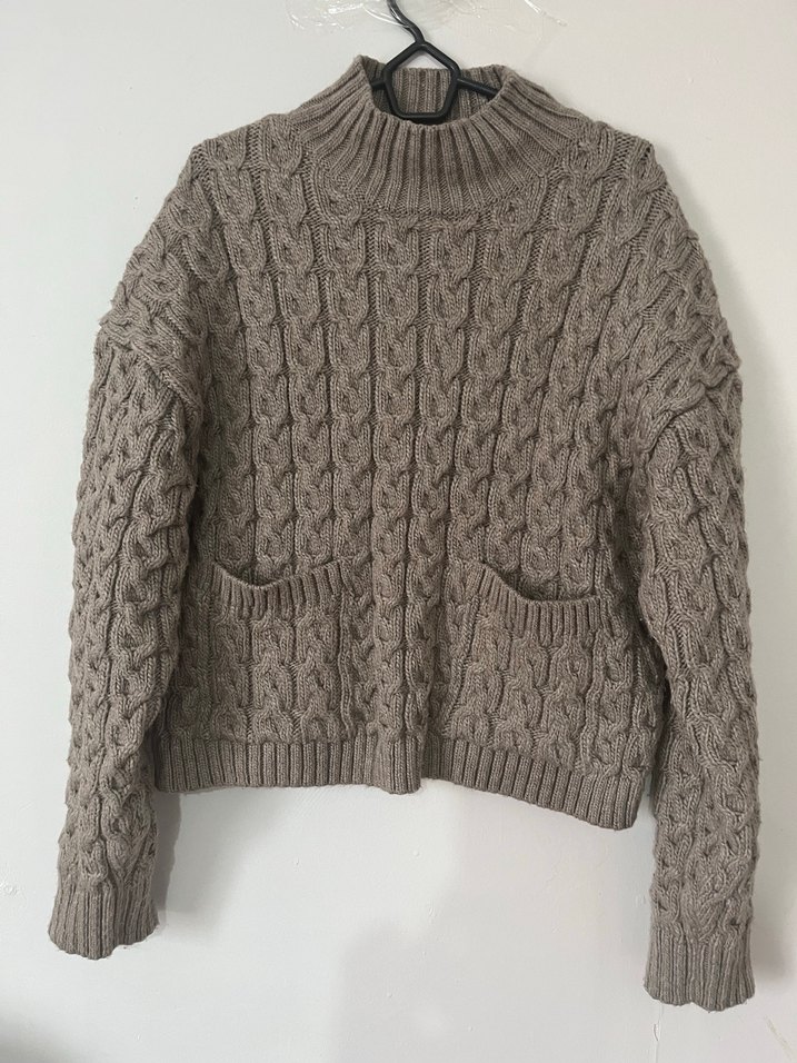 Gri renkli, örgü dokulu kadın kazak yüksek yaka ve uzun kolludur. Rahat kesimi, iki cep detayı ve midi boy uzunluğu ile konfor sunar.