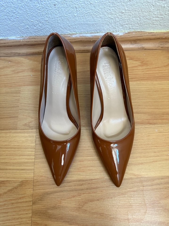 Kahve parlak stiletto topuklu kadın ayakkabılar, kauçuk malzemeden yapılmıştır. Ofis için uygun, çağdaş ve zahmetsiz şıklık sunar.