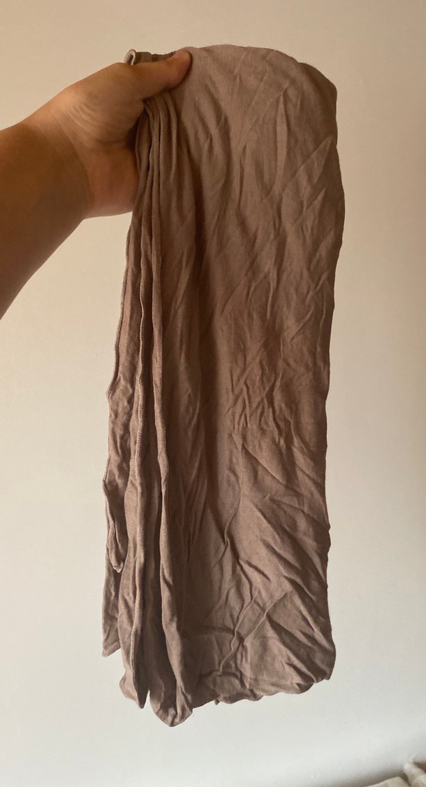 Bej keten kumaştan, drapeli tasarıma sahip kadın şalı. Yumuşak ve doğal dokusuyla minimalist tarzda sade bir aksesuar.