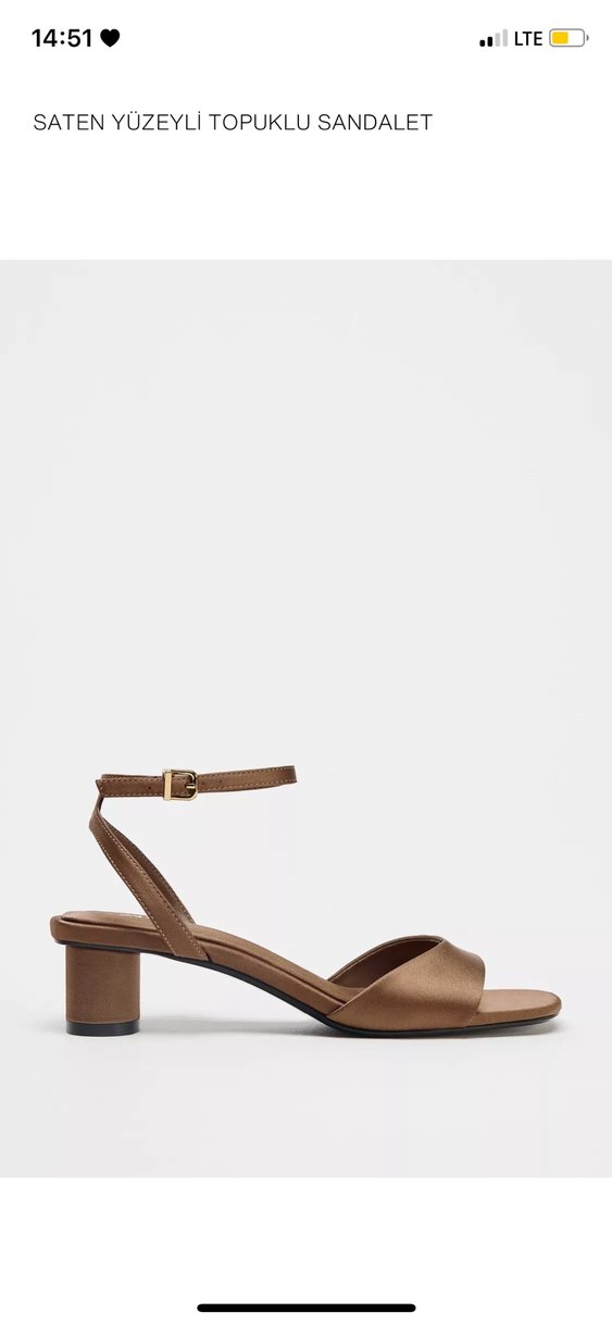 Kahve renkte, bilek kayışlı kadın sandalet. Satenimsi parlak malzemeden, blok topuklu ve minimalist klasik şıklık için uygun, ofis kullanımı için ideal.