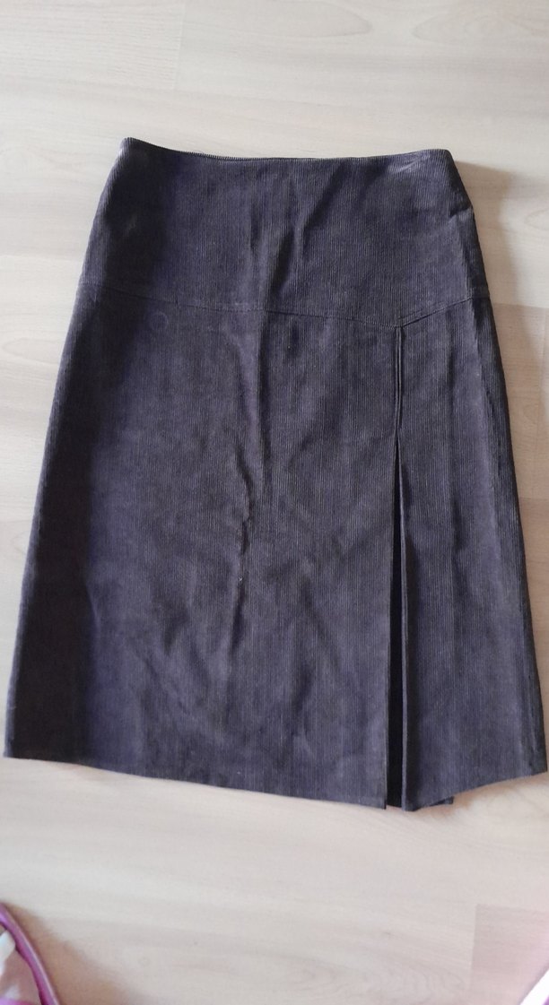 kahve renkte, kadife kumaştan yapılmış, midi boyda ve pileli tasarıma sahip, düzenli kesim kadın eteği. Ofis kullanımı için uygundur.