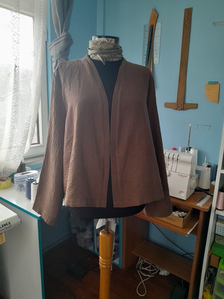 Bej keten kumaştan, salaş kesim, drapeli, normal boy midi ceket. Uzun kollu, deseniz, rahat ve günlük kullanıma uygun.