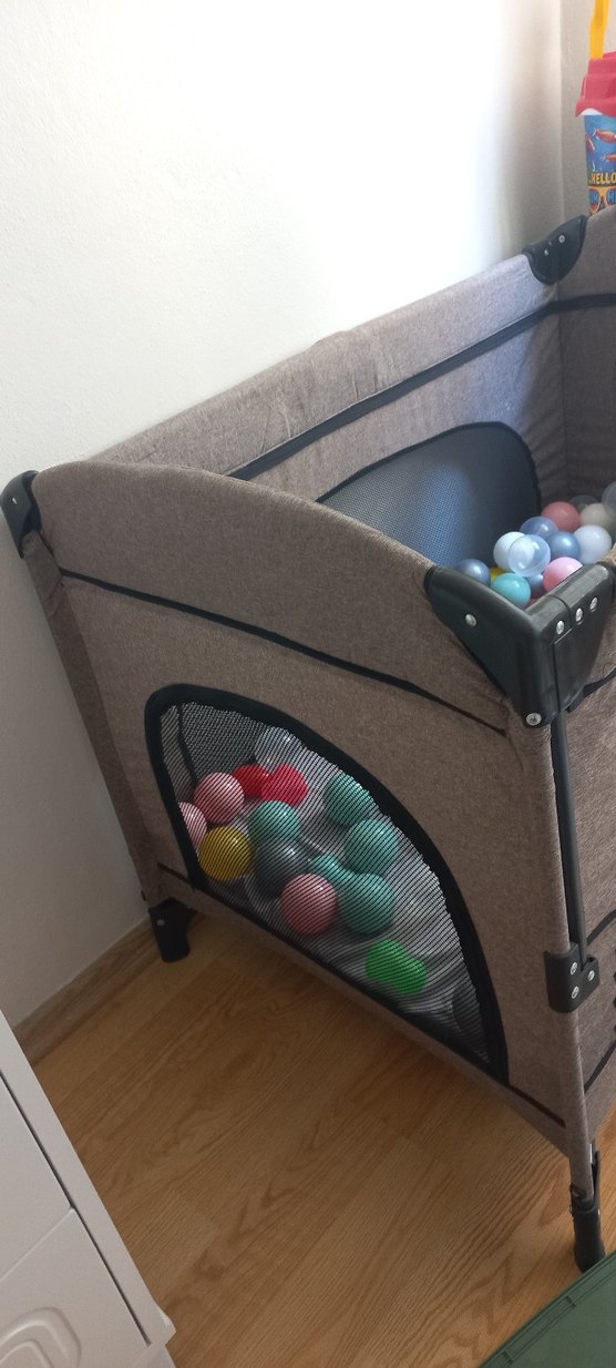 kahve renkli oyun parkı yatağı, çok renkli toplarla dolu file yan cep ile güvenli ve eğlenceli bir alan sunar. Sağlam çerçeve ve nefes alabilir kumaş konfor sağlar. ürünün alt açma ve uyku oyuncakları dahildir. Yerim olmadığı için satıyorum. bebegim 1 2 kez yattı. taşıma çantası mevcuttur.