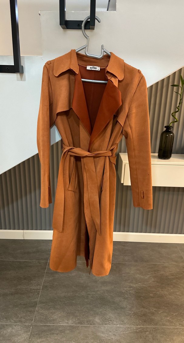 Kahverengi süet trençkot, kemerli ve yakası notched lapel. Hiç bir kusuru yok Boy 95cm