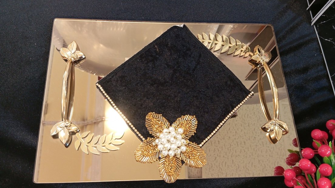Parlak altın renginde, işlemeli ve boncuklu detaylara sahip kahve sunum mendili. Çiçek formunda, klasik ve gösterişli tarzlar için.