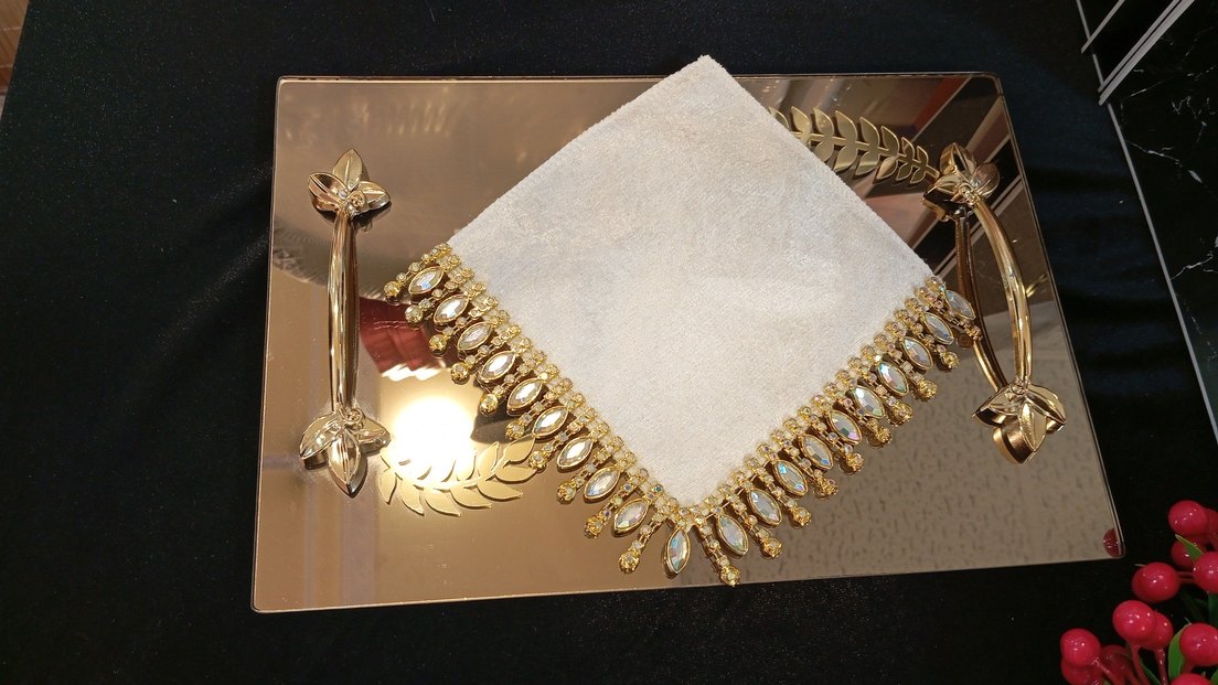Kahve sunum mendili, kenarlarında parlak inci işlemelerle klasik ve gösterişli bir şıklık sunar.