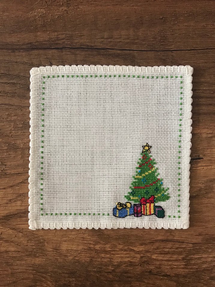 Renkli nakışlı çam ağacı ve hediyelerle süslenmiş el yapımı sunum peçetesi