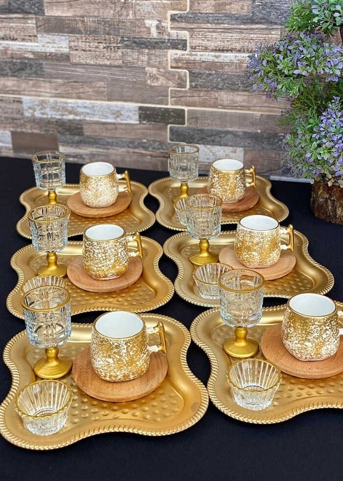 30 parça ponpon kahve sunum seti 6 ad fiyonklu plastik tepsi 6 ad ahşap tabak 6 ad fincan 6 ad lokumluk 6 ad kahve yanı su bardağı *Kahve setleri ve tüm setlerdeki su bardakları stok durumuna göre model değişikliği olur*
