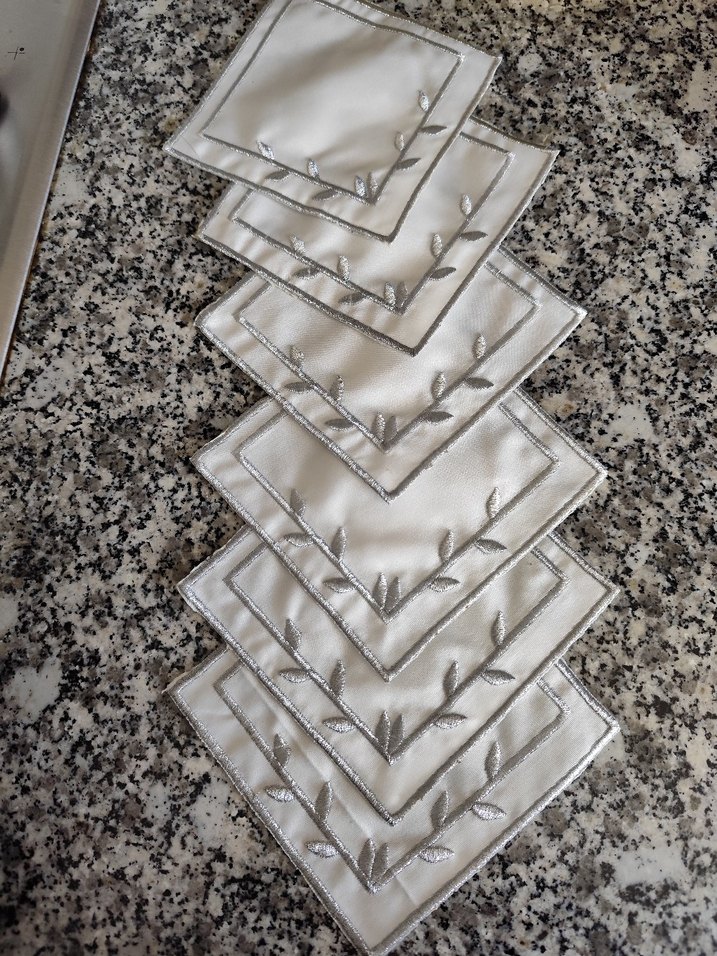 Kenarlarında gri nakışlı yaprak desenleri bulunan beyaz kahve sunumu peçetesi, klasik ve geleneksel tarzda.