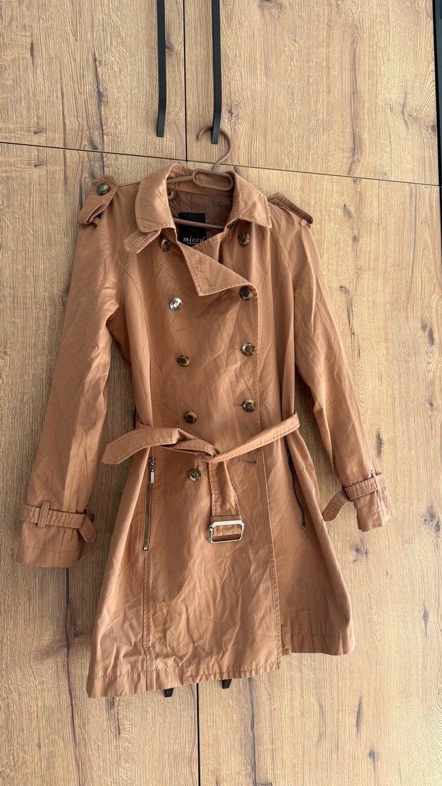 Kahve -taba renkte, kemerli, süet kumaştan yapılmış midi trençkot. Notlu yaka, uzun kollu ve parlak dokusuyla günlük kullanıma uygundur. 36-38 bedene uygundur hiç giyilmedi etiketi üstünde.