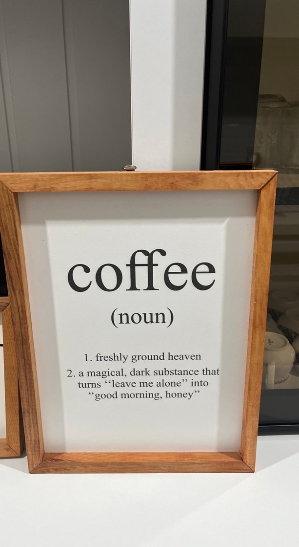 Koyu kahverengi renkte kahve makinesi ve kahvenin sihirli bir karanlık madde olduğunu anlatan çerçeveli yazı içerir. ☕