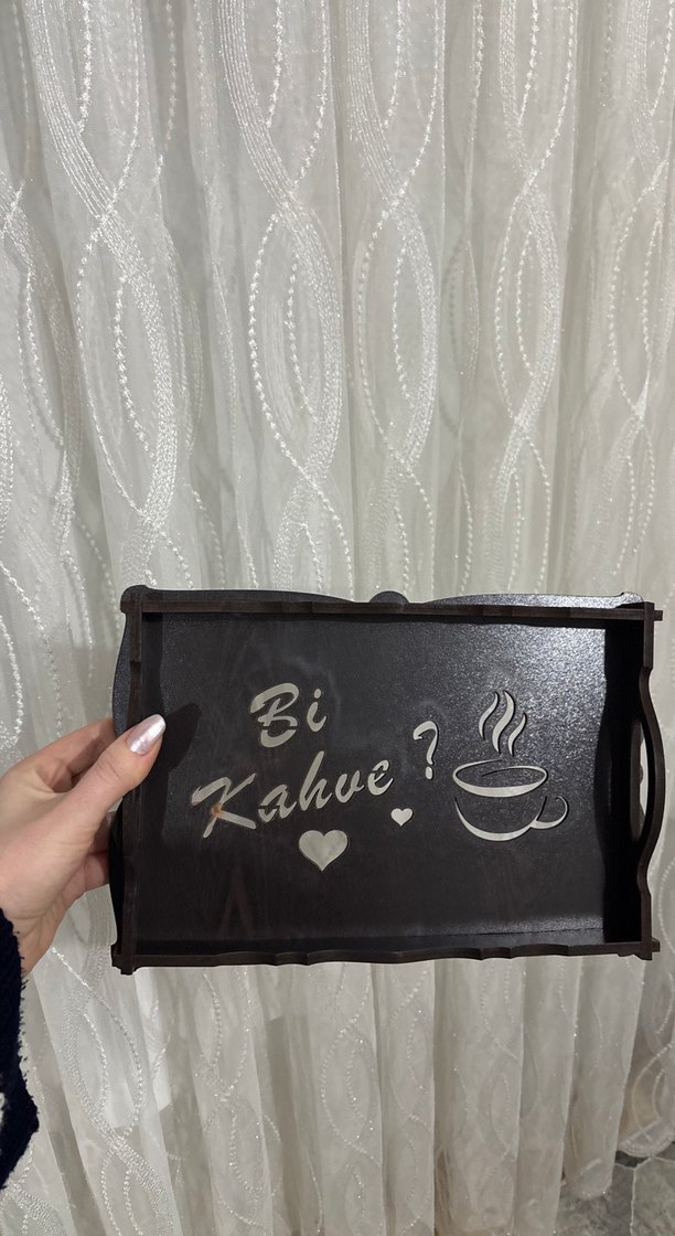Koyu kahverengi ahşap tepsi üzerinde 'Bi Kahve?' yazısı ve kahve fincanı resmi bulunur. ☕