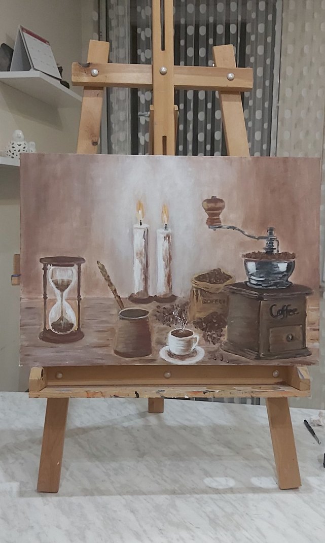 Camel renk tonlarında, kahve temalı; kum saati, mumlar, kahve değirmeni ve kahve fincanı detayları bulunan tablo. ☕kahve surulmus kahve kokulu tablo kahve severlerin mutfagina renk koku katacak