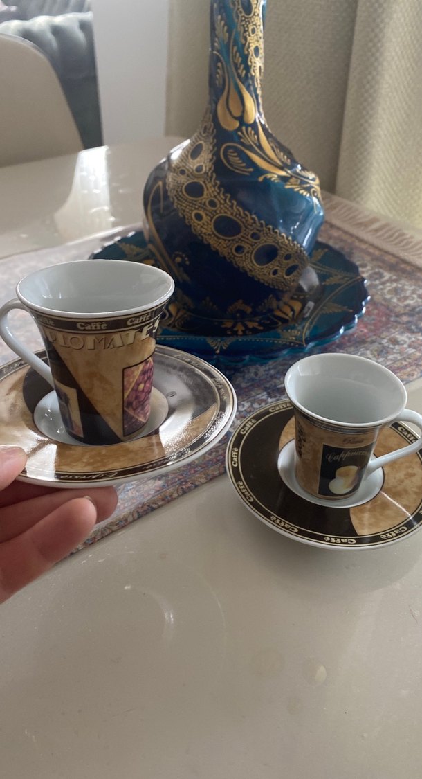 Kahve temalı desenlere sahip espresso fincanları ve tabakları içeren set. Arka planda mavi ve altın detaylı dekoratif bir çay seti bulunuyor. ☕ 2 li