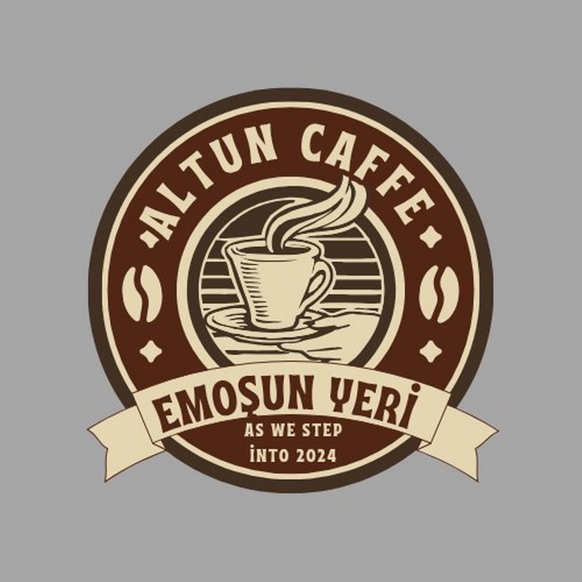 Parlak kahverengi vintage erkek rozeti, kahve fincanı ve 'ALTUN CAFFE', 'EMOSUN YERİ' yazılarıyla. 'AS WE STEP INTO 2024' ifadesi yer alır. ☕ istenilen renkte ve modelde logo hazırlanır