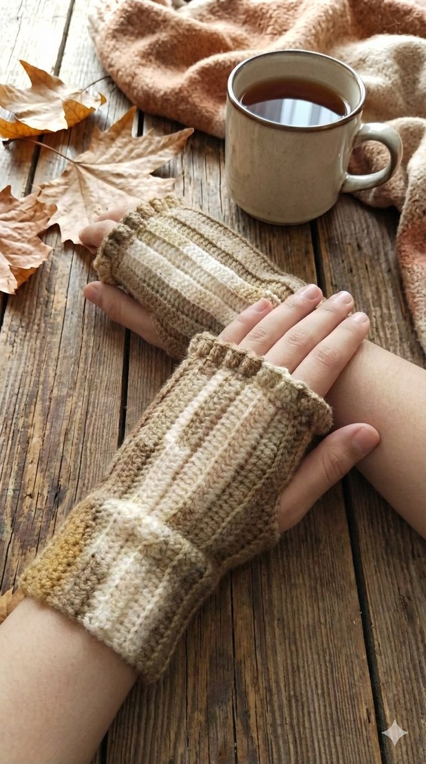 Yumuşak örgü ipten yapılmış, rahat bohem tarzda bej/kahve tonlarında Parmaksız kadın eldivenleri. Vintage ve aesthetic kombinleri sevenler için harika bir kışlık aksesuar.