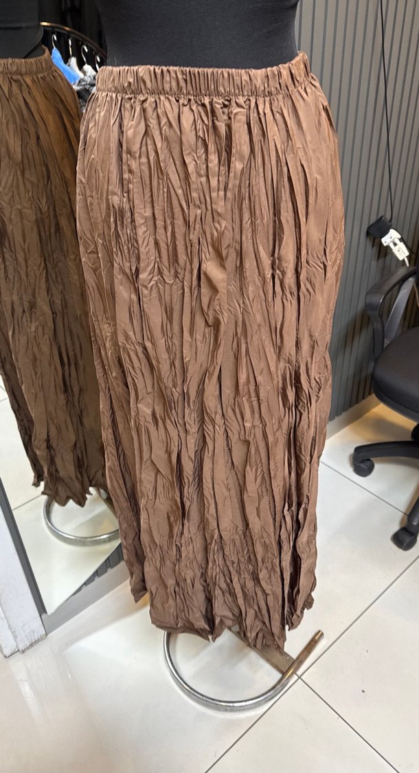 Bej renkte, keten kumaştan uzun pilili etek. Bol kesimli ve bohem tarzda, günlük kullanım için uygundur. İki rengi mevcuttur
