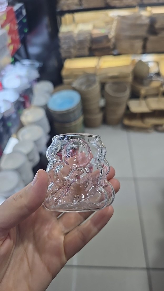 Dekoratif figür şeklinde küçük, şeffaf cam bardak. Gösterim veya küçük servisler için uygundur.
