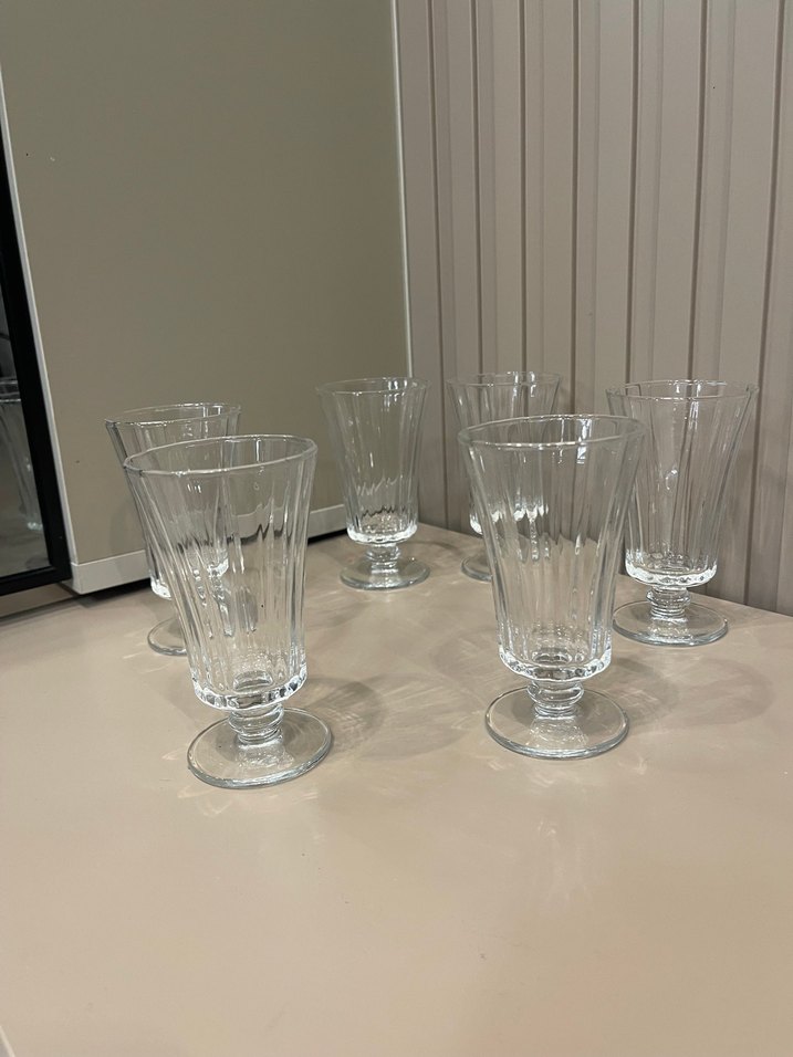 Kahve yanı şeffaf, ayaklı ve dikey çizgili bardak seti. Farklı içecekler için uygundur.