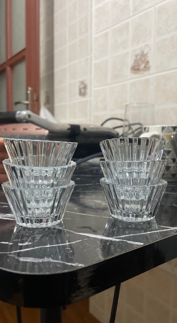 Altı adet kristal görünümlü desenli cam kase. Dayanıklı ve şık tasarımıyla tatlı veya atıştırmalıklar için uygundur. KÜÇÜK SUNUMLUKTUR