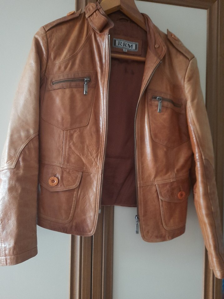 Kahverengi deri, kemerli ve notched lapel yakalı, parlak görünümlü, regular fit biker tarzı, askılı kollu ve çok cepli ceket, günlük kullanım için uygundur.