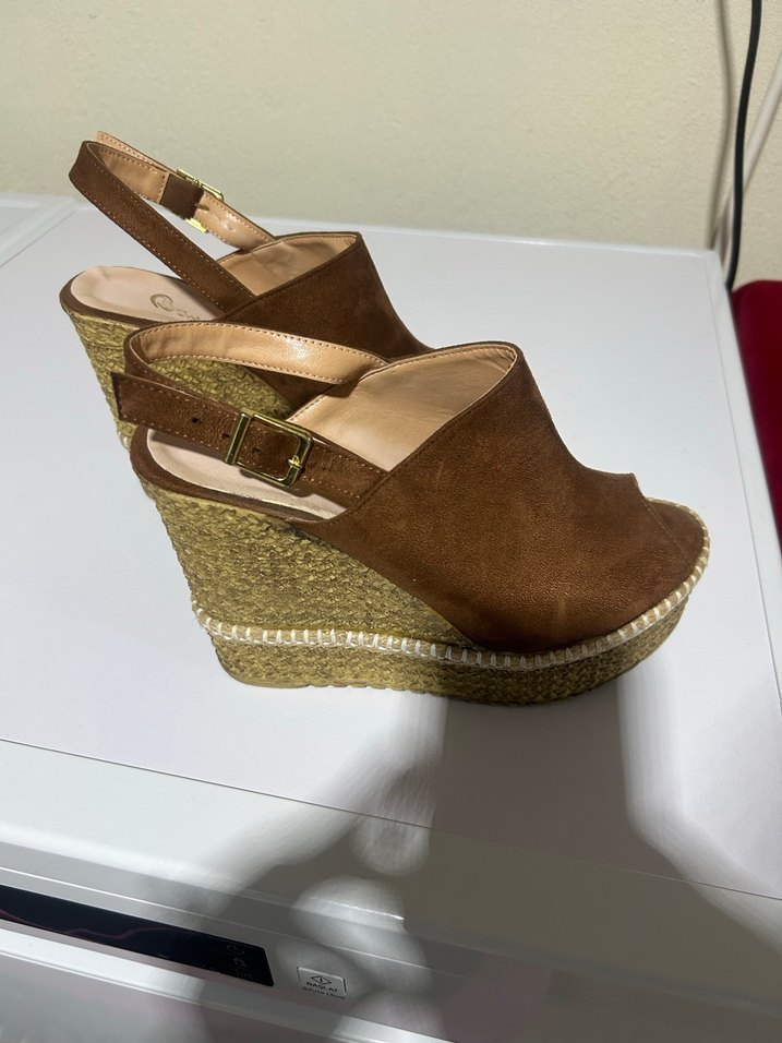 Kahverengi süet dolgu topuklu, tokalı ve parlak yüzeyli kadın ayakkabısı. Bohem tarzıyla minimalist tasarımı birleştirir.