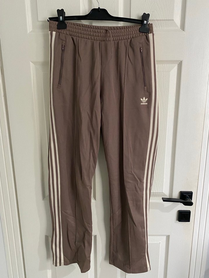 Kahverengi renkli, fermuarlı cepler ve bej şeritler içeren bol kesim kadın eşofman altı. Yumuşak sentetik kumaştan, günlük rahat sokak stili için uygundur.
