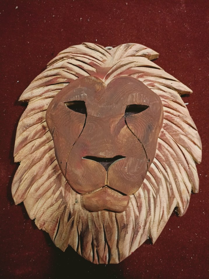 Koyu kahverengi ahşaptan yapılmış, detaylı oymalı yelesi ve yüzü olan aslan figürü. Ahşabın doğal dokusu öne çıkıyor. 34*29 cm ölçülerinde.