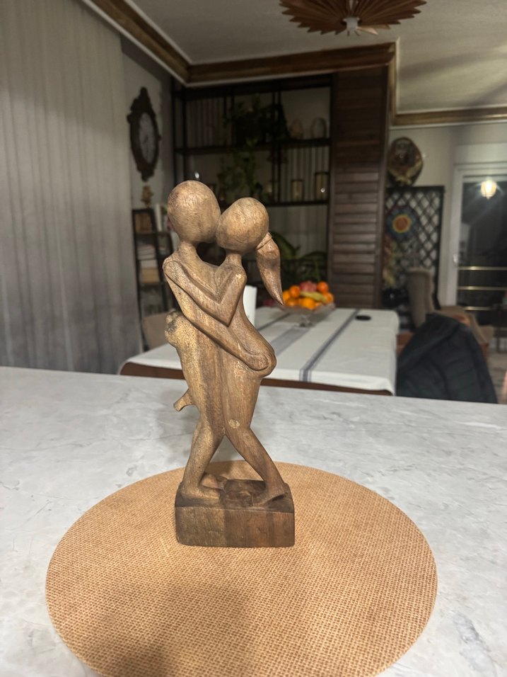Koyu kahverengi ahşaptan yapılmış, kucaklaşan çift figürin. Akıcı hatlarla işlenmiş, doğal bir görünüm sunar.