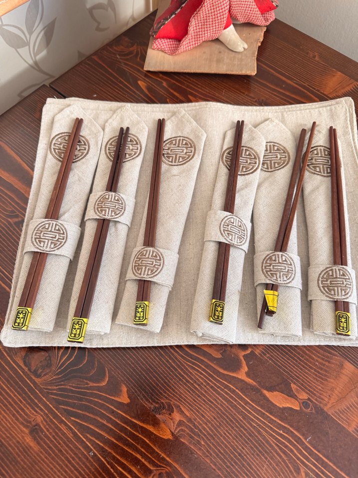 Koyu kahverengi ahşap çubuklar, sushi seti geleneksel desenli bej kumaş kılıflarda düzenli şekilde saklanmıştır. Taşıması ve saklaması kolaydır.