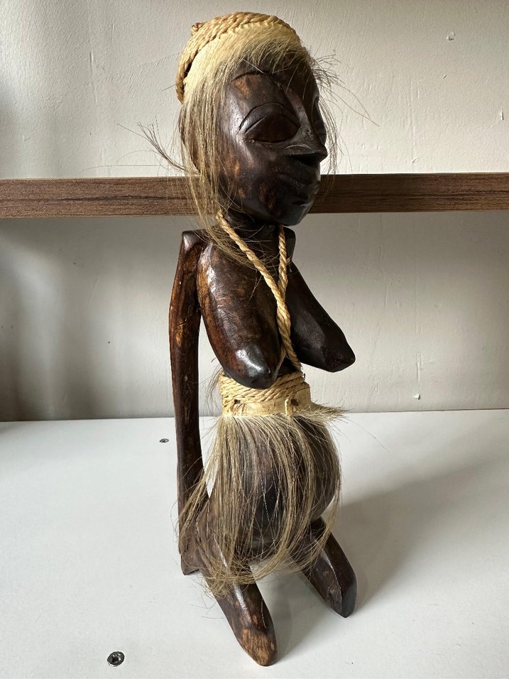 Koyu kahverengi ahşaptan yapılmış, bel ve baş kısmında doğal lif detayları bulunan geleneksel tasarımlı figürin. Ayakta durmaktadır.