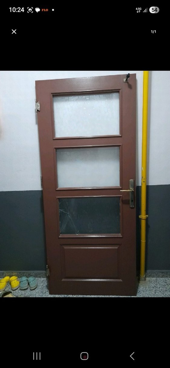 Üç cam paneli ve metal kulpu olan kahverengi ahşap kapı, dolap düzenleyici olarak kullanılabilir. ️