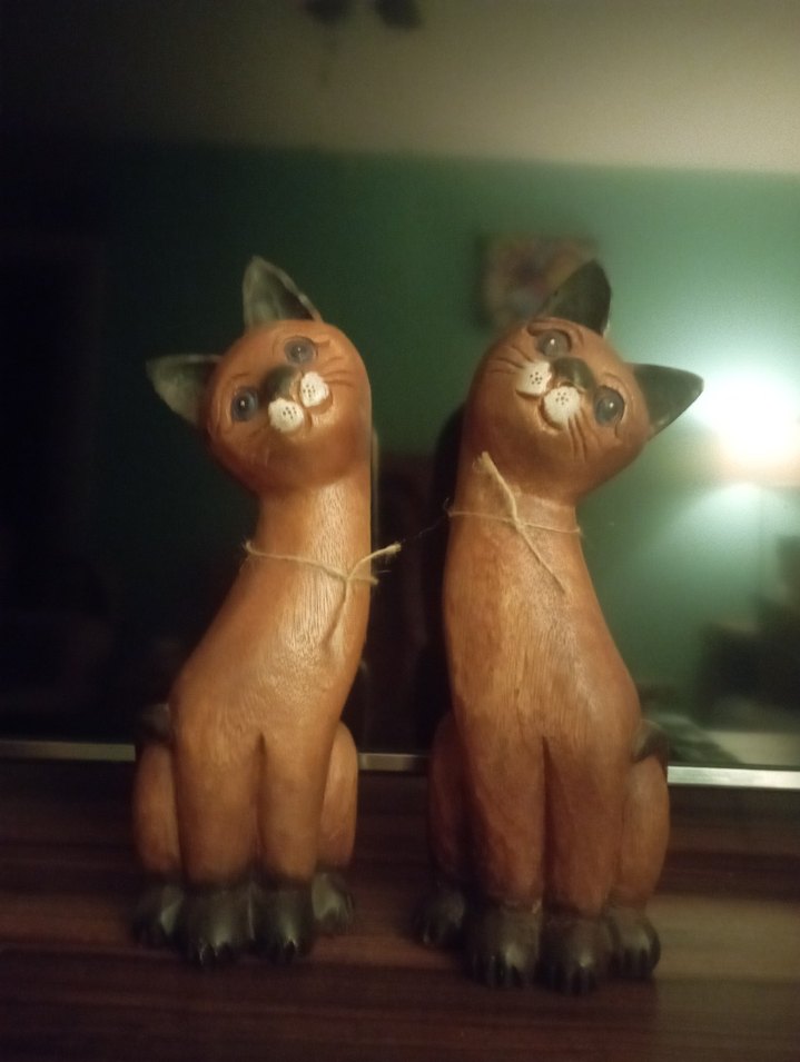 İki adet detaylı yüz ifadeli, boyunları ip bağlı koyu kahverengi ahşap kedi bibloları seti. boy 30 cm